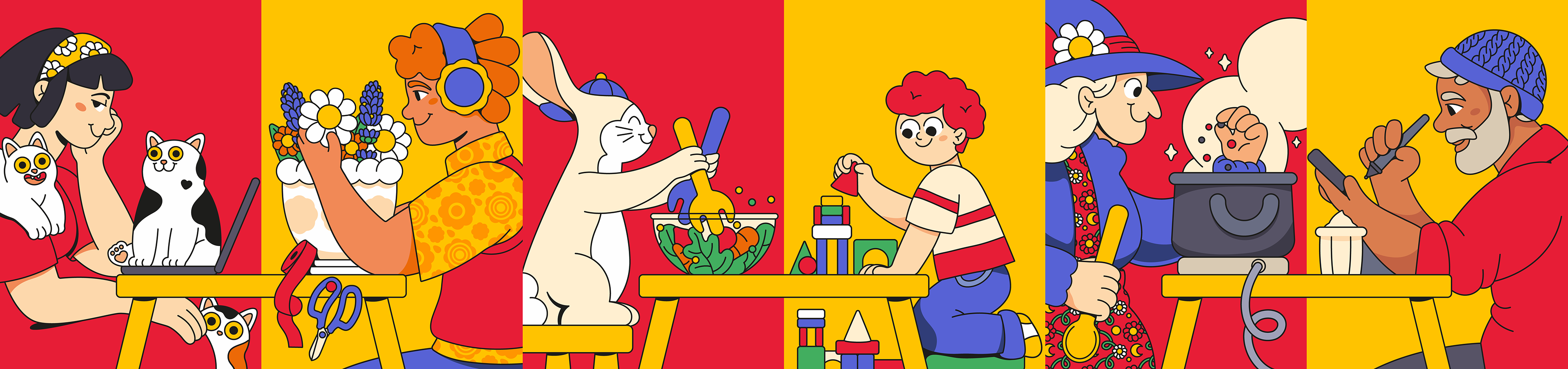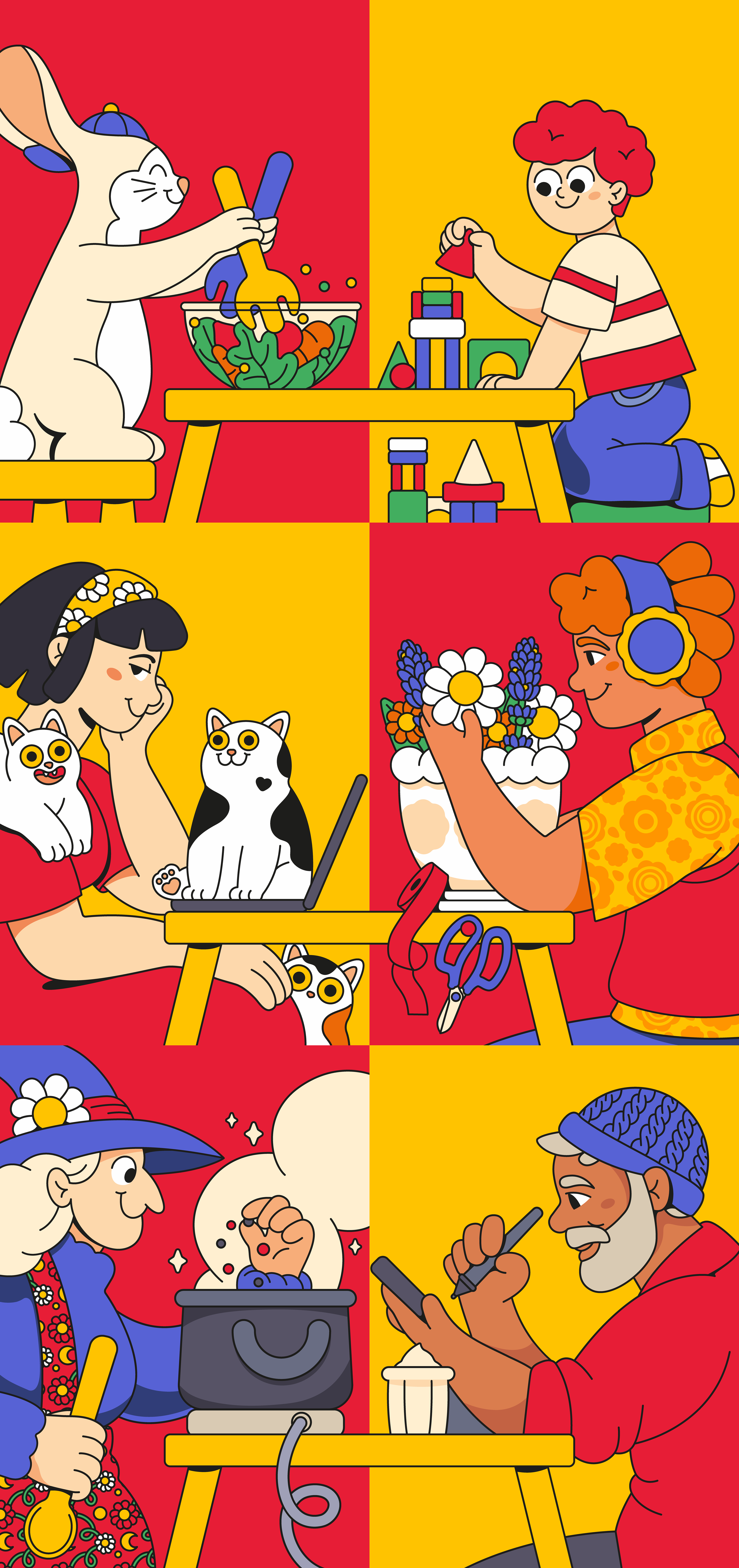 Series of illustrations about co-working spaces, and how the meeting between different characters and perspectives is always a fun, beautiful thing.