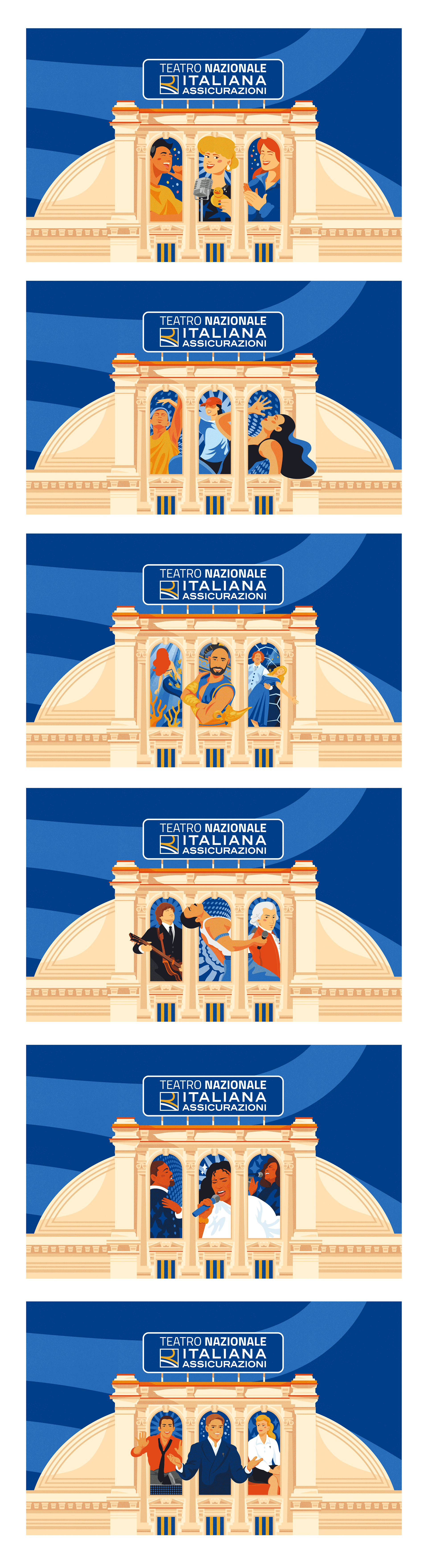 The main design was inspired by Teatro Nazionale of Milan, a venue where people can enjoy all kinds of shows and dramatic pieces thanks to the sponsorship of Italiana Assicurazioni. Both the public and the theatre are key elements of the illustration, evoking the relationship between the venue and its people.