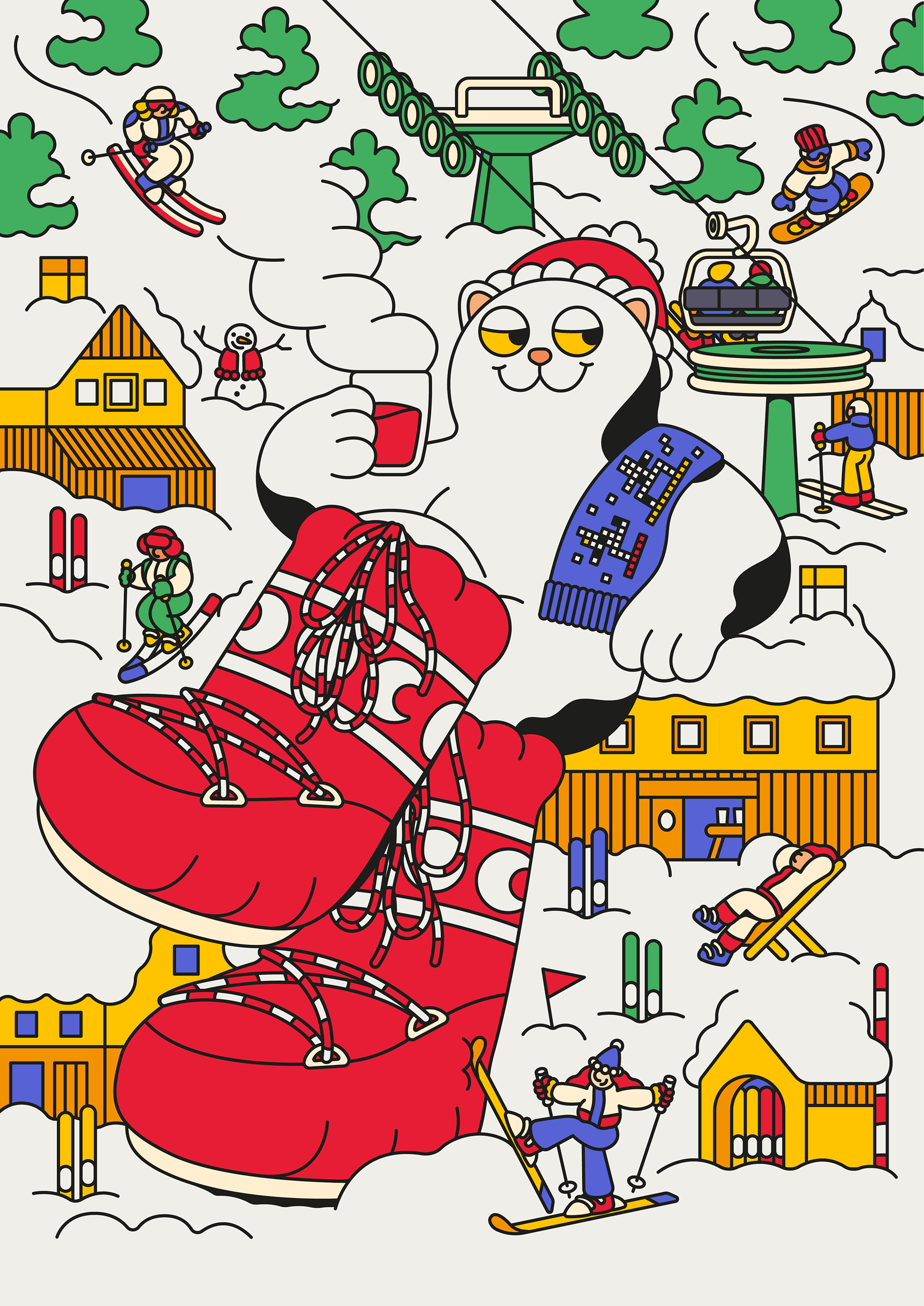 This personal piece is a tribute to cats, winter sports, and the 2026 Pantone of the Year Cloud Dancer.