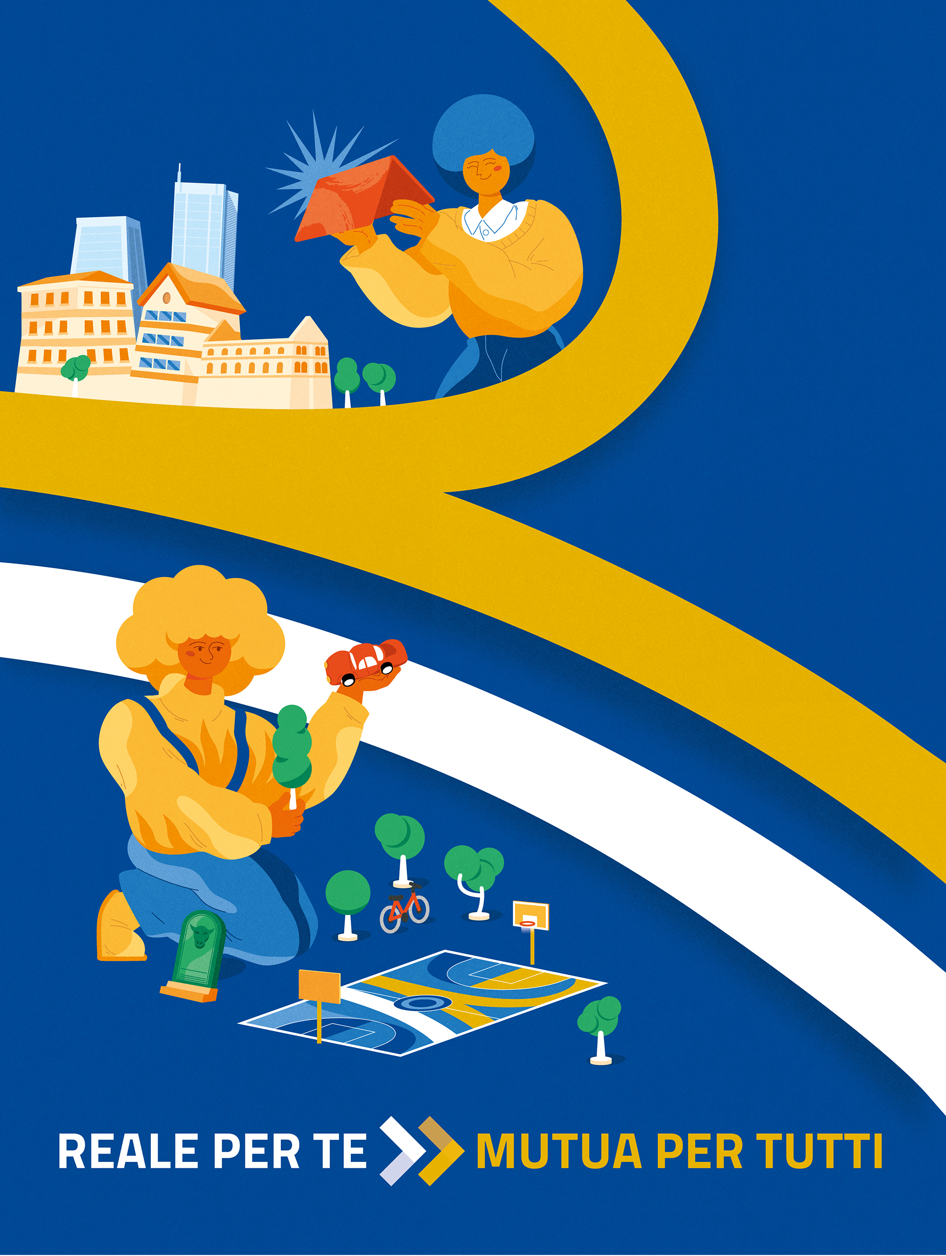 The first step was the creation of the main design for the various formats of journals and planners: an upbeat, colorful illustration where playful characters take care of their city and community, reflecting Reale Mutua's commitment to social and environmental projects.