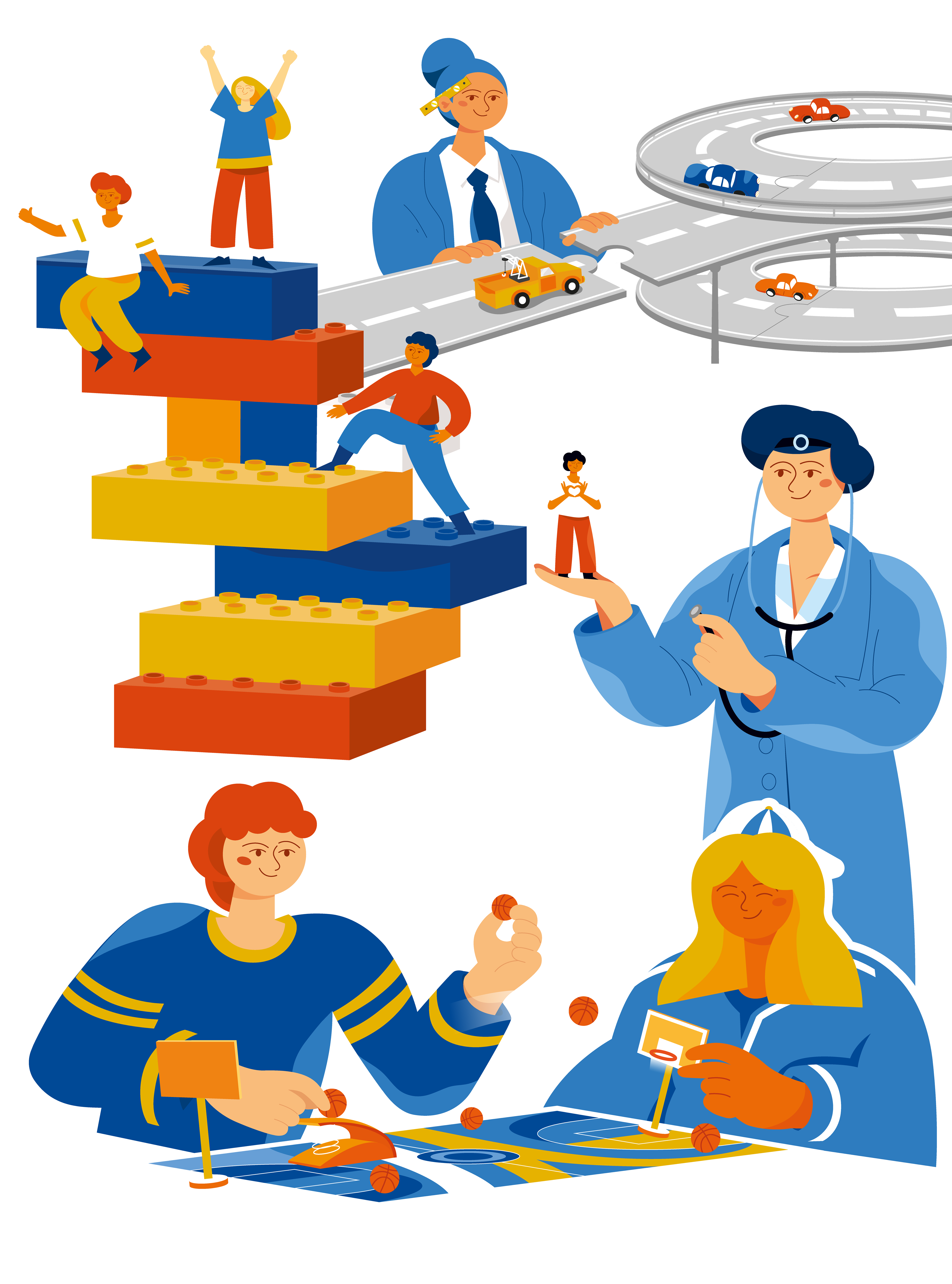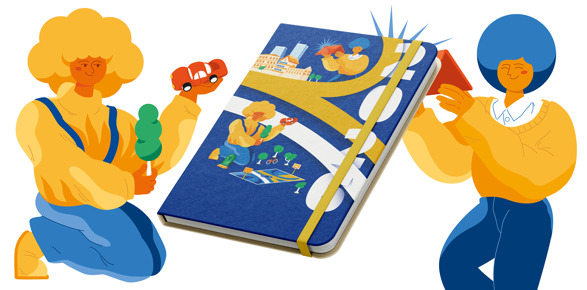 The first step was the creation of the main design for the various formats of journals and planners: an upbeat, colorful illustration where playful characters take care of their city and community, reflecting the company's commitment to social and environmental projects.