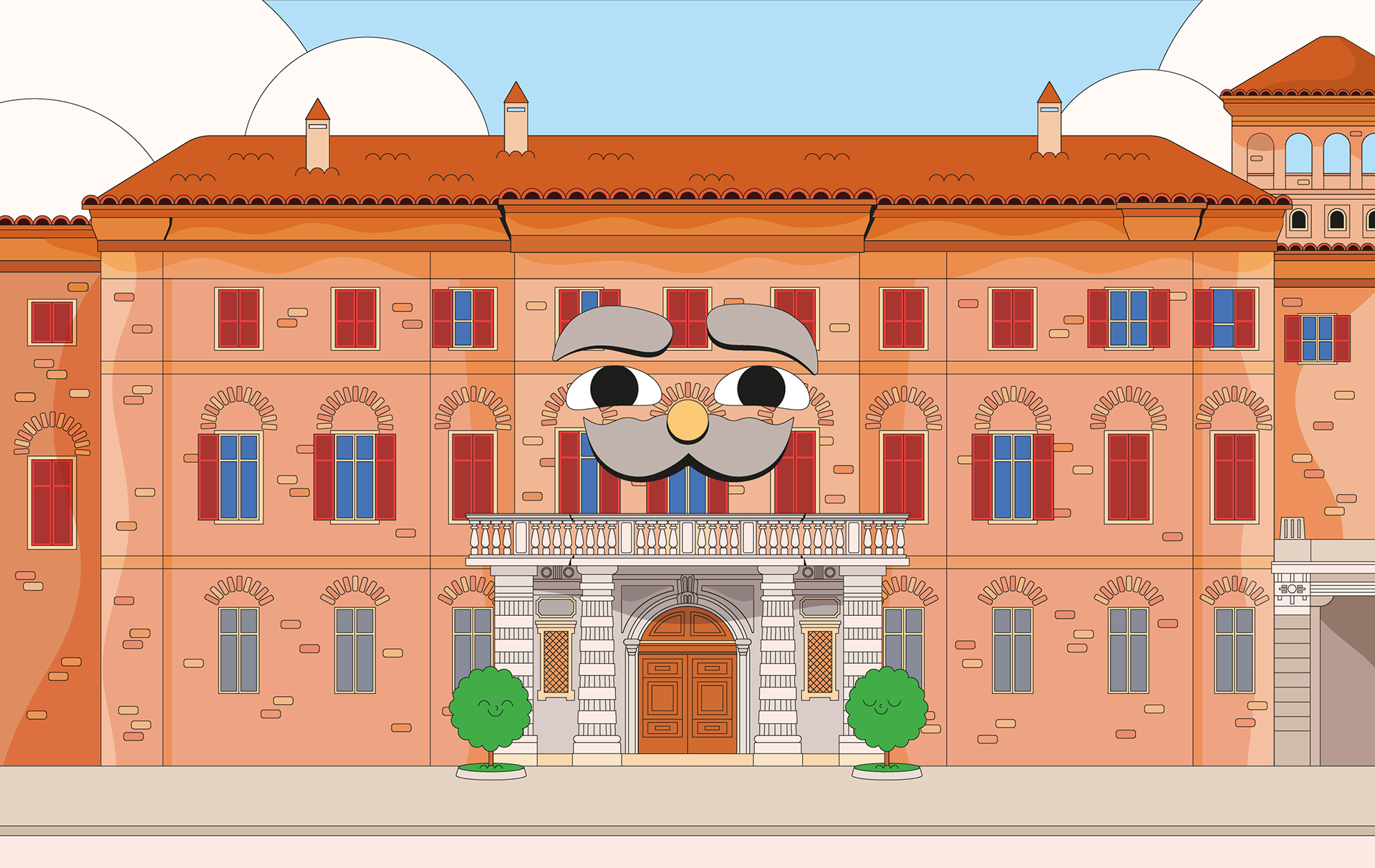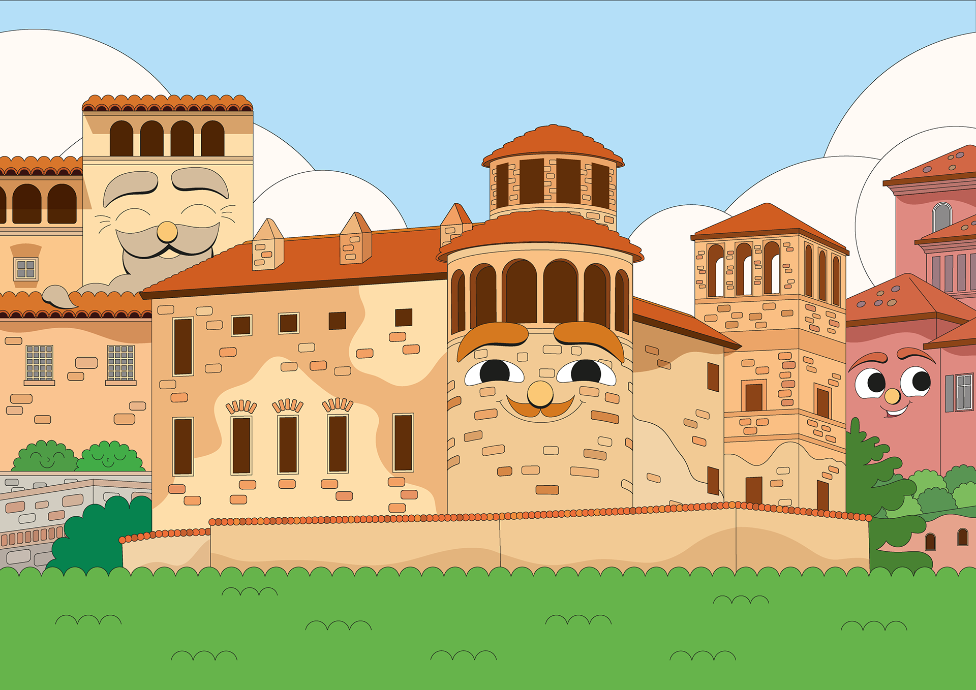I created six characters inspired by as many buildings: the challenge was to make each one unique and to blend the new personality and facial expression with the pre-existing architecture.
